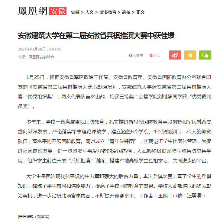 大学生是国防现代化建设的生力军和强大的后备力量,本次兵棋比赛丰富了学生的兵棋知识,锻炼了学生布局和谋略能力,提高了学校国防教育的效果。学校人武部将以此次表彰为契机,进一步钻研此项赛事内容,不断提升竞赛水平。(作者:王凯;审稿:汪翼湧)