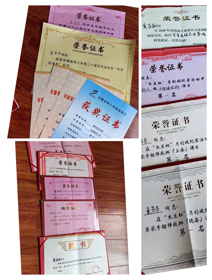 2017年入学后,童芬芬就在学校里获得了一等奖学金、高校部足球比赛二等奖、中国大学生空手道锦标赛第三名等多项荣誉。而两年的军旅生涯,使童芬芬得到了快速的成长,也感受到了自身的不足。