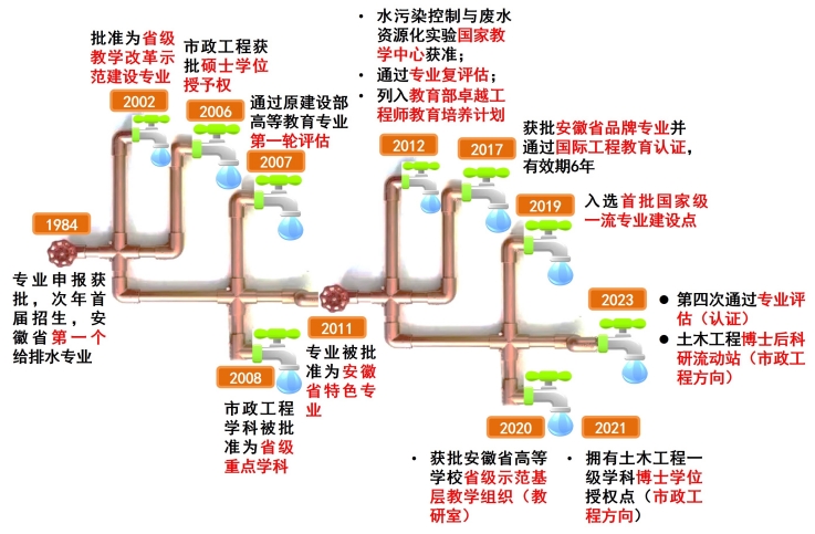 2002年,我校给水排水工程专业被评为省内第一批、我校第一个省级教学改革示范建设专业;2006年,市政工程获得硕士学位授予权;2007年,给水排水工程专业通过建设部专业教育评估;2009年,水污染控制与废水资源化实验教学中心获国家级实验教学示范中心,并于2013年通过教育部验收评审;2011年,给水排水工程专业被批准为安徽省特色专业;2012年,给水排水工程专业加入教育部第二批卓越工程师教育培养计划;2012年,给水排水工程专业通过国家专业教育评估(复评估);2012年,水污染控制与废水资源化实验室被批准为安徽省重点实验室;2013年,给排水科学与工程专业被批准为安徽省综合改革试点专业;2017年,通过国际工程教育认证,有效期6年;2018年,批准为安徽省卓越工程师教育培养计划2.0建设专业;2019年,入选首批国家级一流专业建设点;2020年,批准为安徽省高等学校省级示范基层教学组织(教研室);2021年,拥有土木工程一级学科博士学位授权点(市政工程方向);2023年,第四次通过专业评估(认证),并拥有土木工程博士后科研流动站(市政工程方向),形成了完整的学士、硕士、博士和博士后人才培养体系。