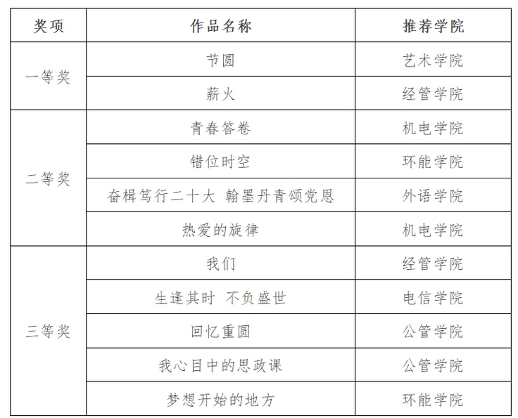 第二届“我心中的思政课”微视频创作展示活动以“强国复兴路,奋斗正青春”为主题,从9月初开始,历时近三个月,在全校范围内收到37份作品。经两轮专家评审,最终评选出一等奖2个,二等奖4个,三等奖。具体如下: