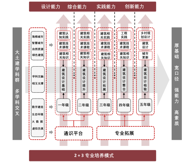 1、构建“纵横结合、系统发展”建筑学专业人才培养模式。“纵”强调“2+3”即“通识平台+专业拓展”的专业培养模式,前二年为建筑类专业基本统一的通识教育和专业基础,后三年转入相应的精专方向的深造,重点放在后三年的专业拓展及实践能力培养。“横”强调贯穿1-5年级的“大土建”学科知识,积极适应“建构大学科发展、多学科交叉”的理念和发展趋势,以学生综合能力、实践能力、创新能力培养为主线,紧紧围绕专业核心课程,加强与其他相关专业的交叉融合,夯实学生专业综合基础,拓展宽口径输出。