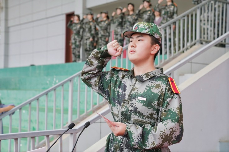 蔡国军一声令下,军训成果展示正式拉开帷幕。首先亮相的是拼字方阵,学员们以精准的跑位、默契的配合,诠释了对祖国的赤诚热爱和对学校精神的领悟;行进间队列方阵表演中,同学们步伐铿锵有力,动作整齐划一,彰显出严格的纪律性和高度的协同精神;战术方阵的演示将现场气氛推向高潮,学员们模拟战场环境,灵活施展战术动作,彰显了过硬的军事素养;刺杀操方阵的同学们口号如雷,突刺凌厉迅猛,动作刚劲有力,尽显一往无前的战斗作风;匕首操方阵的女同学们手持训练匕首,动作干净利落,喊杀声清脆响亮,巾帼不让须眉的英姿成为操场上一道亮丽的风景;格斗术方阵的学员们身手敏捷,展现了扎实的防身自卫能力和勇毅顽强的意志。最后,全体参训学员以一场气势磅礴的大合唱为成果展示画上圆满句号。
