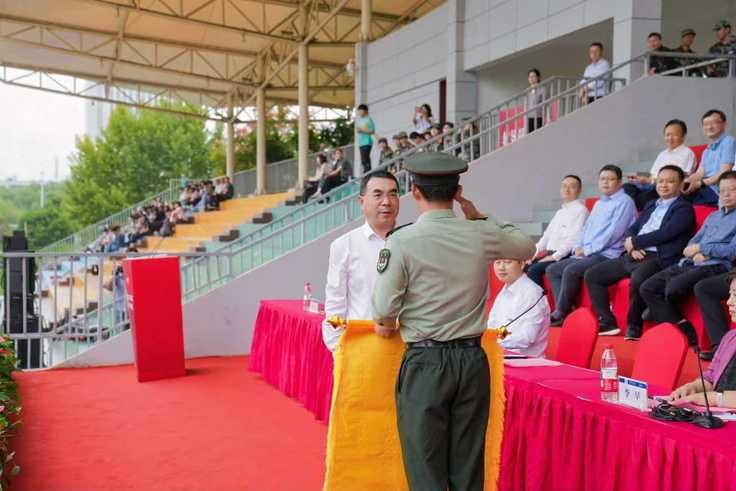 蔡国军代表学校向承训部队赠送锦旗,表达了对承训部队全体官兵辛勤付出、严格施训、无私奉献的崇高敬意和衷心感谢。