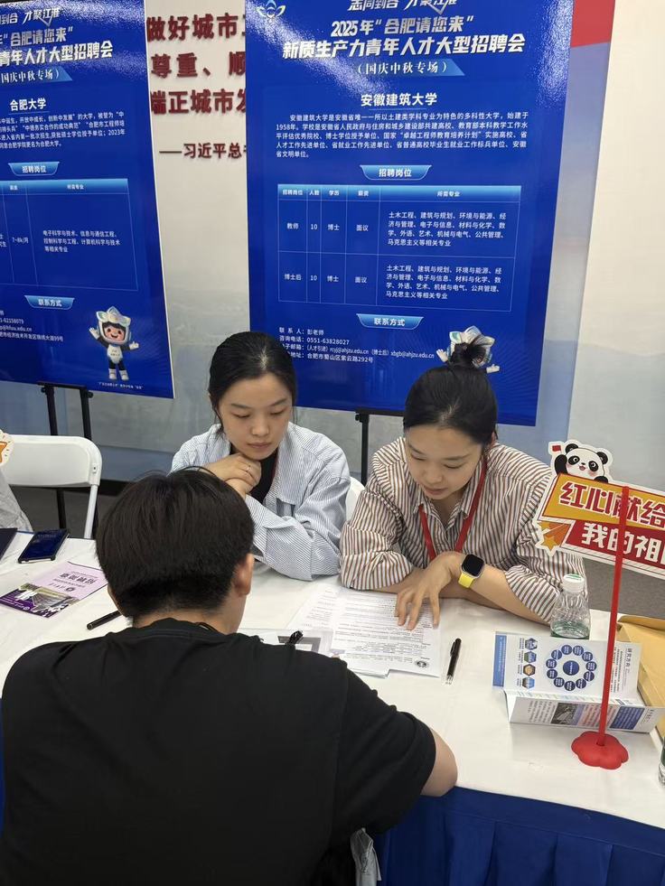 本网讯 9月29日,“志同到合 才聚江淮”2025年“合肥请您来”新质生产力青年人才大型招聘会在合肥骆岗公园举行。本次人才招聘会汇聚200家左右重点单位,包括在肥高校、新研机构、科研院所以及新质生产力龙头企业等,提供涵盖人工智能、新能源、生物医药等重点产业链领域的1万余个优质岗位,共吸引8500余名全国青年人才奔赴而来。学校人事处组织参会,面向全国招聘高层次青年才俊。
