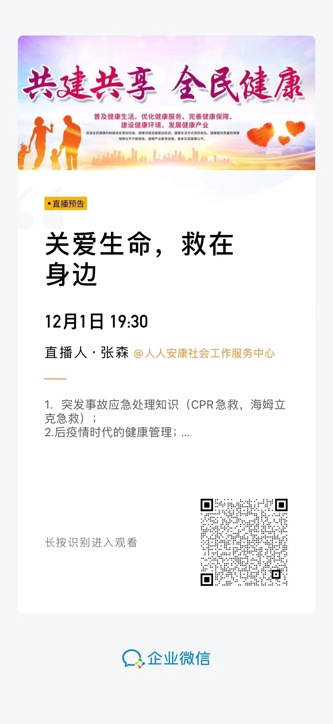 四、注意事项。微信识别方案中的二维码预约直播,开播前会有提醒,用微信扫码就可观看直播。学习结束后会有二维码签到环节,务必扫码进行签到,用于统计参与人员,签完到即可退出直播间,如有健康问题可在课程结束后咨询宣教老师,健康与灾难不能仅靠医疗和救援更要注重宣传和预防,望各位职工予以高度重视,积极参与,健康共享。
