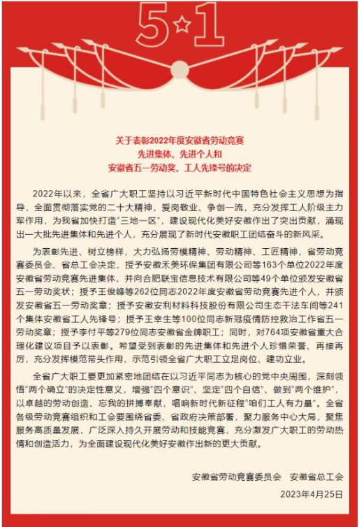 本网讯 近日,安徽省总工会、安徽省劳动竞赛委员会发布了《关于表彰2022年度安徽省劳动竞赛先进集体、先进个人和安徽省五一劳动奖、工人先锋号的决定》,我校数理学院教师李璐被授予安徽省劳动竞赛先进个人,并颁发安徽省五一劳动奖章。