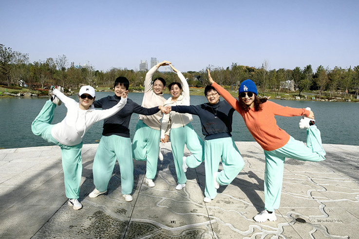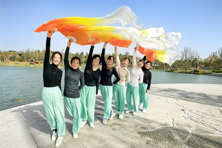 大家漫步在林荫路上,纷纷扬起手中的长扇,在湖边翩翩起舞,她们的幸福笑容,美丽身姿,为安徽园再添一道美丽的风景。