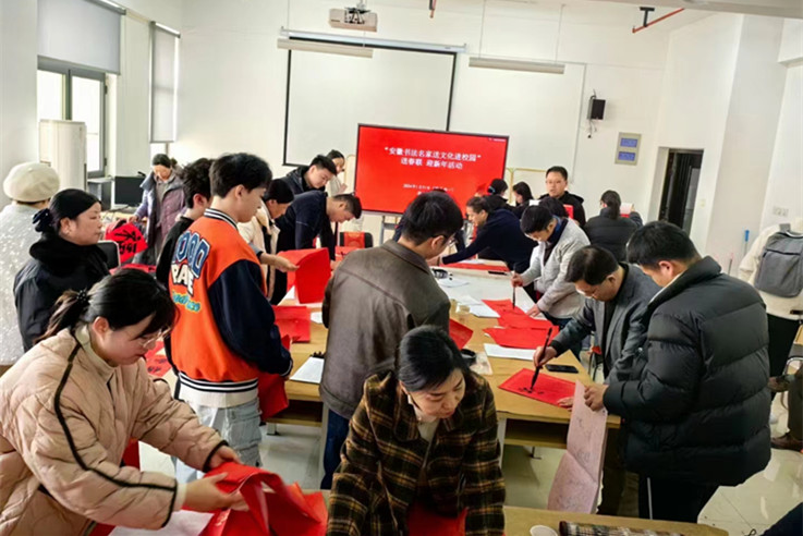 本网讯 喜迎甲辰,笔写华章。为营造欢乐祥和的节日氛围,丰富师生的精神文化生活,推动中华优秀传统文化进校园,校工会联合艺术学院、安徽文艺评论创作基地暨文艺志愿服务点共同举办“安徽书法名家送文化进校园——送春联迎新年”活动,邀请安徽省书法家协会副主席石海松、陈智、秘书长程多林,中国民协理事、安徽省民间文艺家协会副主席刘晓明、秘书长史培刚,安徽省青年书协副秘书长张勇等艺术名家为师生书写春联,送上新年祝福。