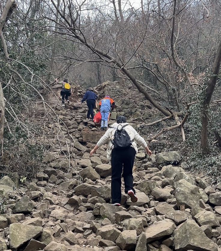 活动当天,天空一扫前几日阴雨。学院女教工们热情高涨,在裁判指令下大家争先恐后,你追我赶从山脚出发,沿登山路线快步前行。随着比赛的进行、路程的增加,参赛人员体力消耗巨大,大家相互鼓劲加油,挽手而行。最终,全体女教工均成功登顶。