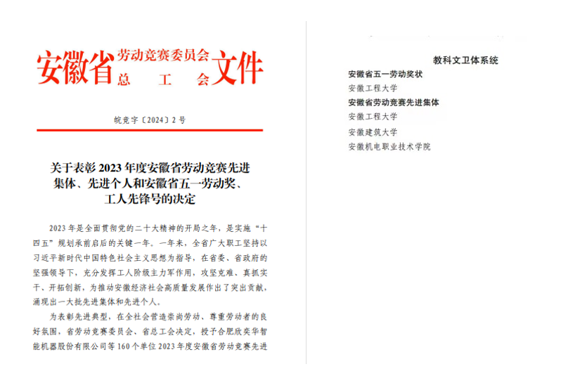 本网讯 今日,省劳动竞赛委员会、省总工会印发《关于表彰2023年度安徽省劳动竞赛先进集体、先进个人和安徽省五一劳动奖、工人先锋号的决定》(皖竞字〔2024〕2号),我校喜获2023年度“安徽省劳动竞赛先进集体”荣誉称号。