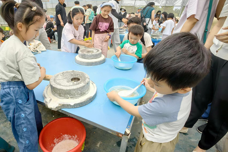 在蔬菜种植和古法磨豆浆体验环节,孩子们在家长的帮助下通过铲土、播种、填土,自己动手磨豆浆,通过劳动,孩子们亲身体验了农民劳作的辛苦,对“谁知盘中餐,粒粒皆辛苦”的诗句有了更加深刻的理解。