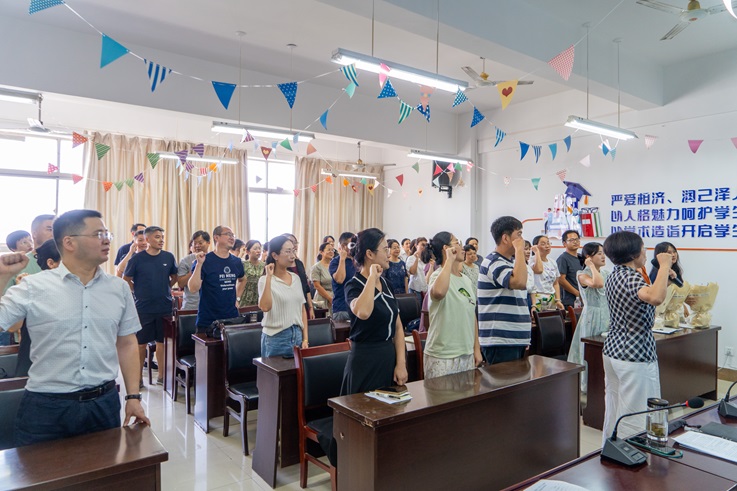 全体新教师进行入职宣誓。通过庄重的入职仪式,让教师们更加坚定了职业信念和道德操守,不忘立德树人初心,牢记为党育人、为国育才使命。