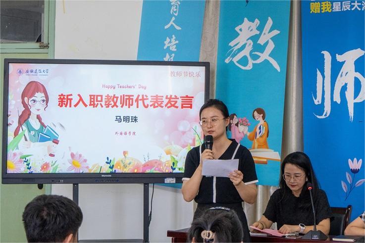 学院党总支副书记汪令宇向全体教职工介绍今年新进教师的基本情况并对他们表示热烈的欢迎。马明珠代表新进教师发言。
