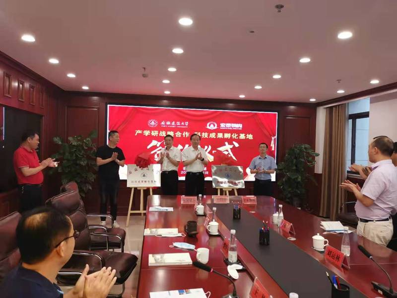 本网讯 8月11日,校党委常委、副校长蔡新立率科技成果转化中心、科技处、土木学院、环能学院相关负责人赴太湖县开展校企合作推动科技成果转化。蔡新立一行在县招商中心与安庆市专精特新企业安徽宏泰钢构股份有限公司举行产学研战略合作、科技成果孵化基地签约揭牌仪式,太湖副县长、县经开区管委会主任杜林出席签约仪式,经开区管委会党工委副书记郝绍明主持仪式,县住建局党组书记、局长柴旺喜,县住建局副局长、学校挂职干部满大伟参加活动。