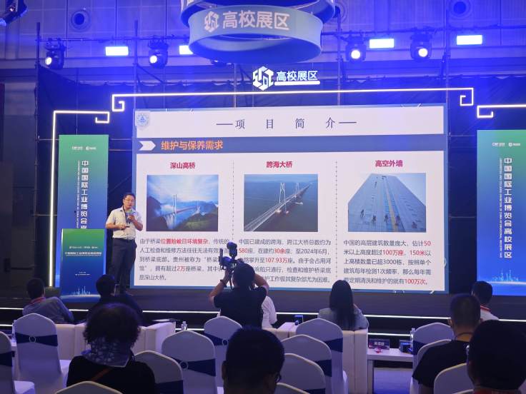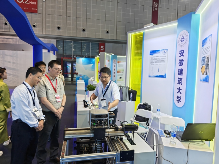 为推动科技成果与市场需求精准对接,深化产学研协同创新,展会设置了高校科技成果展区。高校科研成果展示区汇集了来自北京大学、复旦大学、上海交通大学、西北工业大学等68所高校精心遴选的580项科技创新成果。学校遴选高层建筑快速逃生救援装备和绳驱动无源抗干扰起重装备两项科技成果参展。