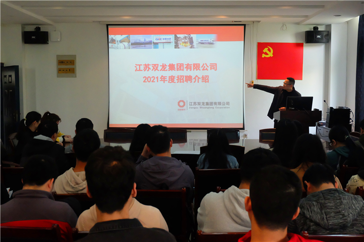 针对有求职意向的学生,江苏双龙集团有限公司还在学院会议室作了专场宣讲,详细介绍了公司的企业文化、产业结构、福利待遇等,并就同学们关心的问题进行了有效沟通,邀请同学们的积极加入。