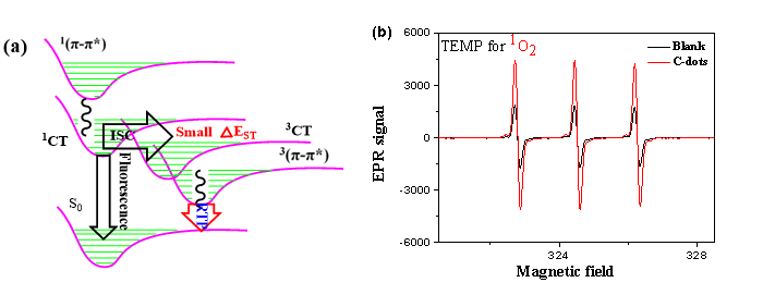 3. IPA-C-dots的室温磷光和荧光示意图(a)。在四甲基哌啶(TEMP)水溶液中,有碳点的溶液和无碳点的溶液在365 nm紫外灯照射1min后的EPR光谱(b)