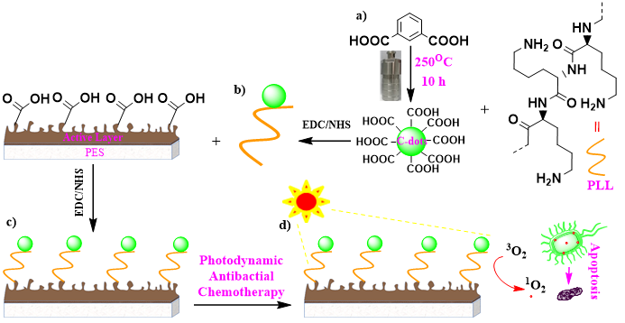 1. 室温磷光间苯二甲酸碳点的合成 (a), 间苯二甲酸碳点与聚赖氨酸的偶联(b), 间苯二甲酸碳点/聚赖氨酸纳米复合材料偶联到正渗透膜活性层(c)和抗菌(d)示意图。