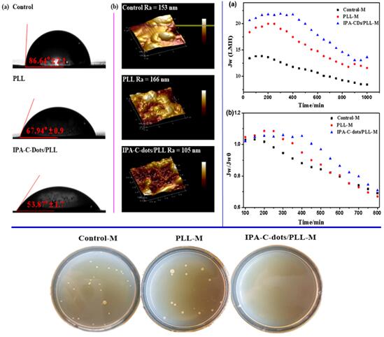 2. 对照膜,PLL改性膜和IPA-C-dots/PLL改性膜的水接触角(a)AFM图像(b)(上-左)。 动态抗菌实验中各组在加速生物污染条件下随时间变化的水通量(a)和归一化水通量(上-右)。静态抗菌实验中各组膜上存活的大肠杆菌在琼脂平板上生长的菌落图(下)。