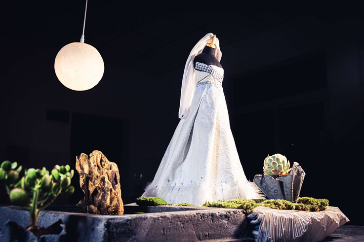 作品主体的裙子由水泥制成,用羽毛和衣物粘贴亮片适当修饰,衣物染料绘制,最终作品成功的保留了水泥本身的纹路沟壑,让水泥不再简单地停留于刚性构造,而是可见的装饰美,突出混凝土的柔之美,让混凝土的“柔”与水泥的“刚”相互结合。