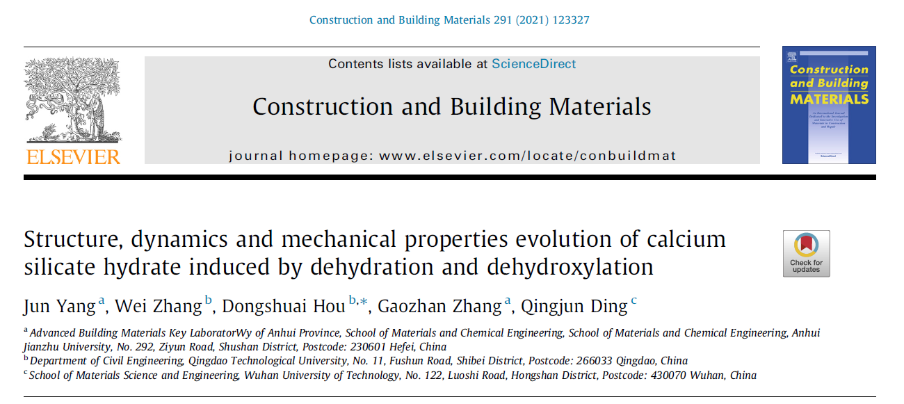 这也是杨军博士联合青岛理工大学侯东帅教授在《Construction and Building Materials》发表的题为“Structure, dynamics and mechanical properties evolution of calcium silicate hydrate induced by dehydration and dehydroxylation” https://doi.org/10.1016/j.conbuildmat.2021.123327高水平论文之后的又一项重要成果。