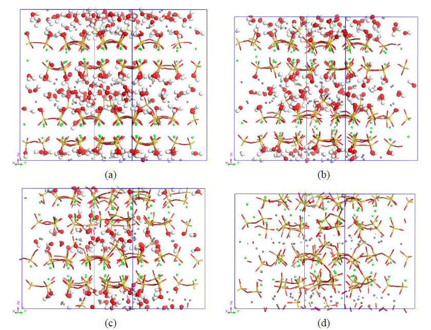 Figure 2. Molecular structures of the C-S(-H) with hydration degree of (a) 100%, (b) 60%, (c) 30% and (d) 0%. The molecular structures for all the models are presented in Supporting Information. (Yellow and red sticks represent the Si-O bonds; red and white ball-sticks represent hydroxyls and water molecules; green and gray spheres are calcium atoms in principal layers and interlayer regions, respectively; red points denote ionic oxygen atoms)