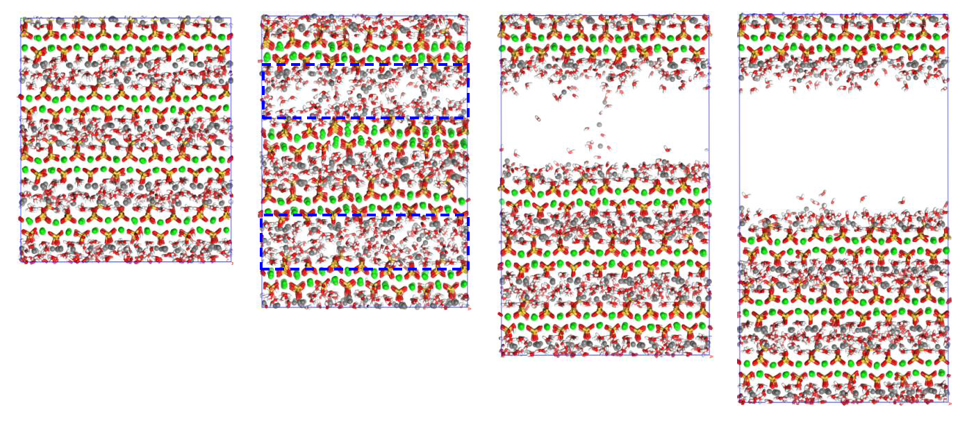 Figure 14. Molecular structure evolution (view along y direction) of C-S(-H) models with hydration degrees of 100% (first row) and 0% (second row) during z axial tensioning. The first, second, third and fourth columns are configurations at strains of 0.0, 0.2, 0.4 and 0.6 Å/Å, respectively.