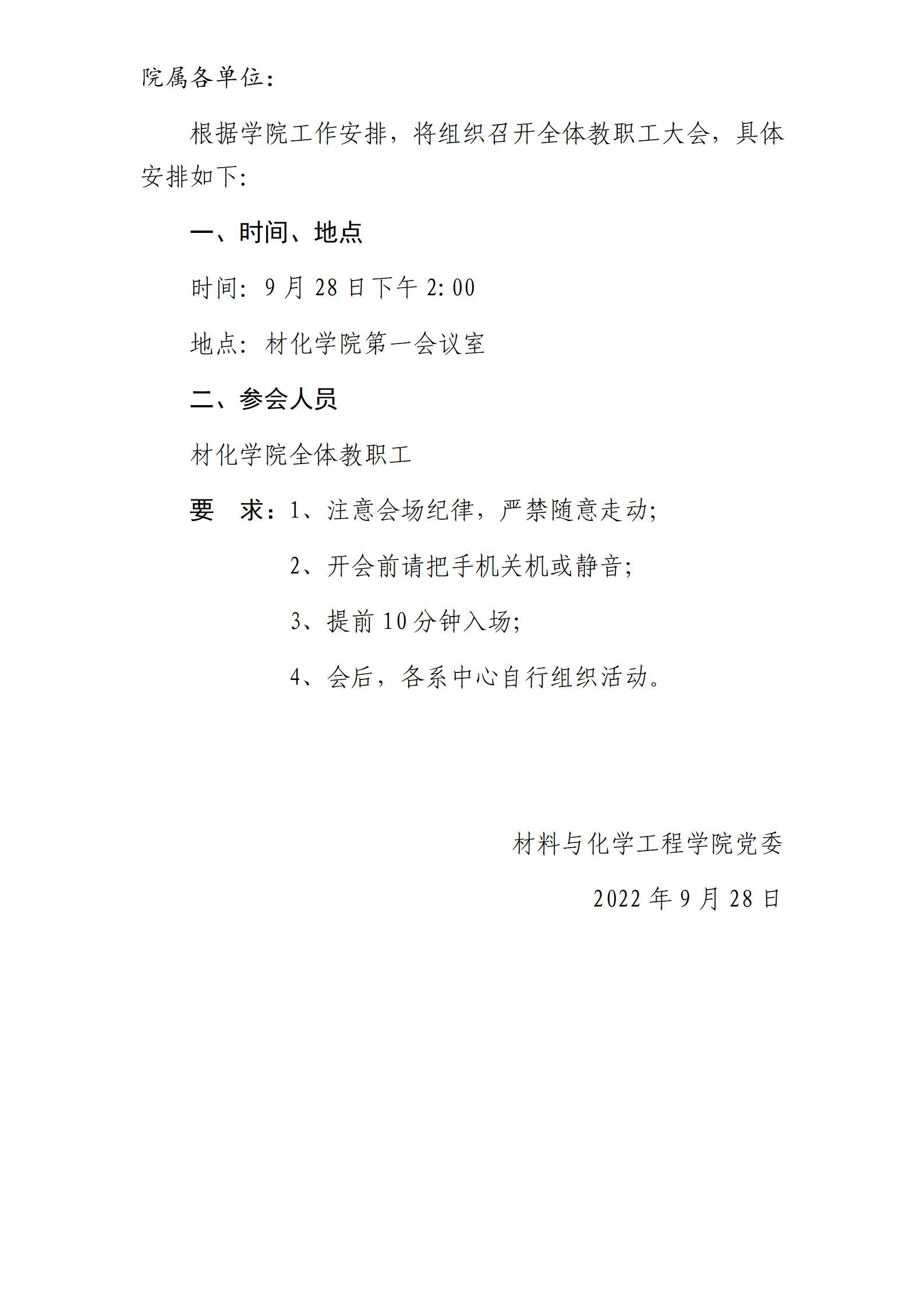 材化学院组织召开全体教职工大会的通知