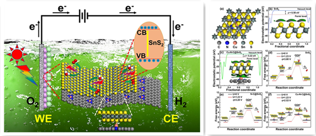 传统光阳极材料大多面临着较低的反应动力学以及较低的载流子分离和传输效率,本工作利用简单有效的界面化学键键合策略,在碳氮载体与SnS2之间构建N-Cu-S化学键,实现了高效的电荷收集和分离。该研究为金属硫化物与碳材料之间的紧密接触和载流子快速分离传输构建提供了一种高效可行的途径。硕士研究生张成明为本论文的第一作者,王秀芳教授为论文通讯作者。
