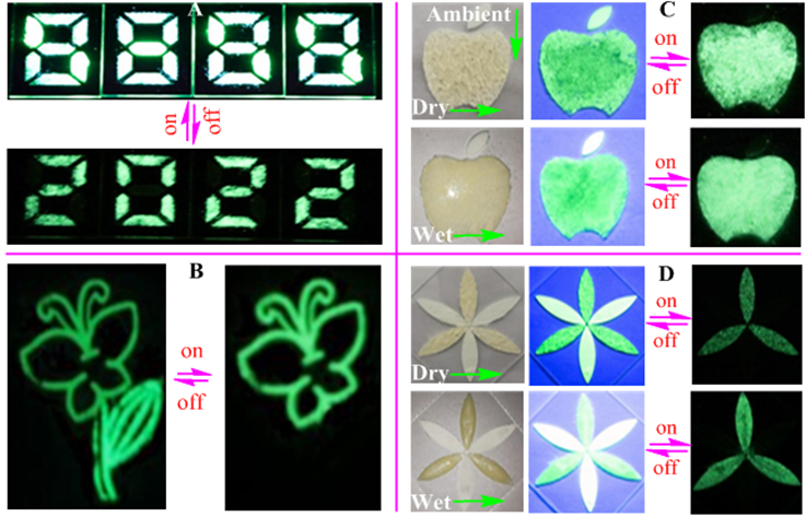 团队以市售的相同发射颜色的短寿命荧光粉与合成的长寿命RTP C-dots一起,应用于信息加密及其时间分辨成像(图2-左)。当灯源打开时,呈现“8888”与“蝴蝶花”状图案。当灯源关闭后,呈现“2022”与“蝴蝶”图案。前后不一致的结果论证了RTP C-dots可用于信息加密。当把水滴加到“苹果”与“梅花”图案上时(图2-右),短寿命的荧光粉发射消失,留下了“不带蒂的苹果”与对程的“三叶”图案,论证了RTP C-dots优异的抗氧与时间分辨信息加密能力。