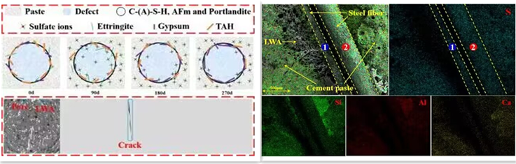 考虑到UHPC结构在实际服役过程中长期遭受荷载和环境介质的影响,李洋同学开展了轻质UHPC在弯曲荷载与硫酸盐耦合作用下的微结构损伤与性能劣化机理研究。论文研究了弯曲荷载作用下硫酸根离子在轻质UHPC中的迁移行为,发现轻集料的多孔特质不仅缓解了侵蚀产物对界面区的膨胀作用,而且通过吸附有效减弱了硫酸根离子的迁移,从而减缓了轻质UHPC的损伤速率。