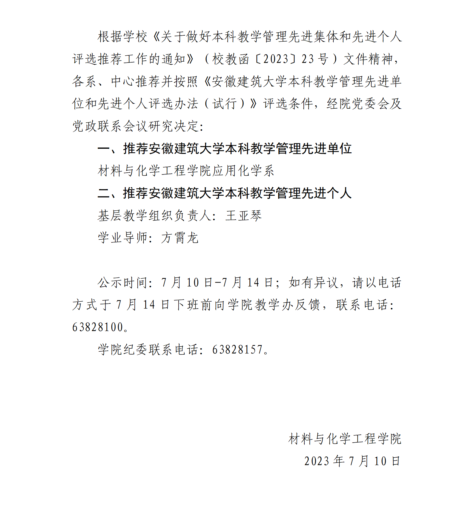 关于推荐2023年度本科教学管理先进集体和先进个人的公示