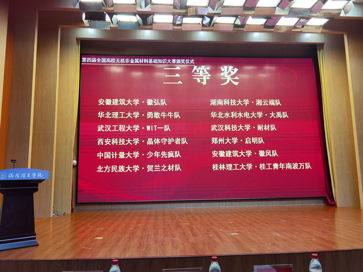 本网讯 8月16日至18日,第四届全国高校无机非金属材料基础知识大赛在洛阳隆重举行。本次大赛由中国建筑材料联合会专家委员会主办,教育部材料类专业教学指导委员会作为学术指导,中国建筑材料联合会专家委员会教育与人力资源学部和洛阳理工学院共同承办的。我校材化学院党委书记万德军、无机非金属材料工程专业教师马瑞和杨军等带队参加了本次赛事。