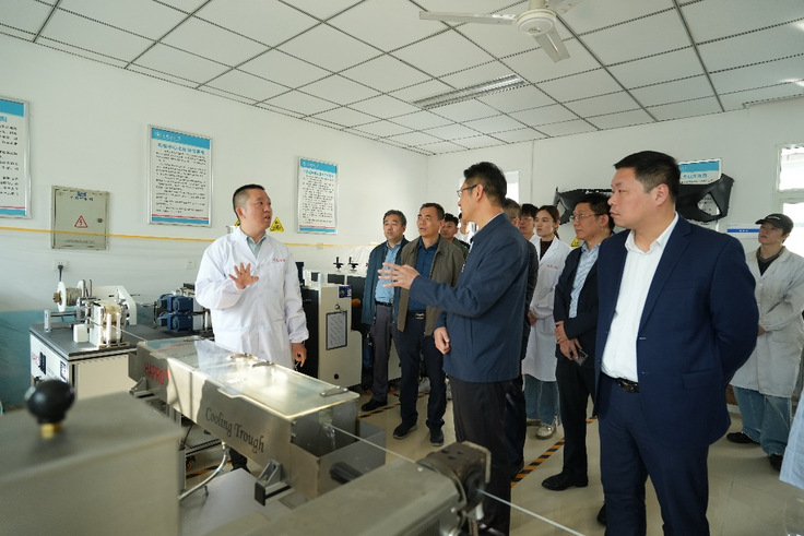 马文革一行现场查看了中心材料成型加工设备和相关科技成果,听取了王平团队的现场汇报,详细了解了中心在特种线缆领域、生物基新材料领域以及严苛环境服役材料领域的研究成果以及产学研合作情况。