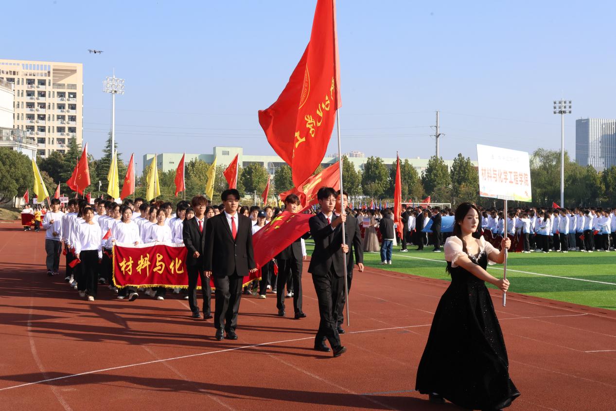 开幕式上,材化学院代表队身着统一设计的运动装,步伐整齐划一,高举旗帜步入体育场中心,“挑战自我,顽强拼搏;材化健儿,志在必得。”口号嘹亮,赢得了全场观众的热烈掌声。