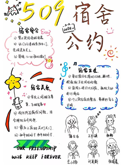 宿舍公约由宿舍全体成员共同商讨并制定,内容覆盖学习、生活、卫生、作息及人际交往等多个维度,并鼓励宿舍成员发挥创意,为公约增添独特的文化内涵,彰显宿舍的个性和精神风貌。学院全体学生积极响应、踊跃参与,认真设计出许多富有独特创意的作品,有的是精心手绘,有的是制作海报,有的是PPT呈现……形式丰富、构思精妙,宿舍成员的共同期望与目标被创意十足地展现在公约之中。经过两轮评议,最终,4#513、4#509、17#416三个宿舍的作品荣获一等奖。