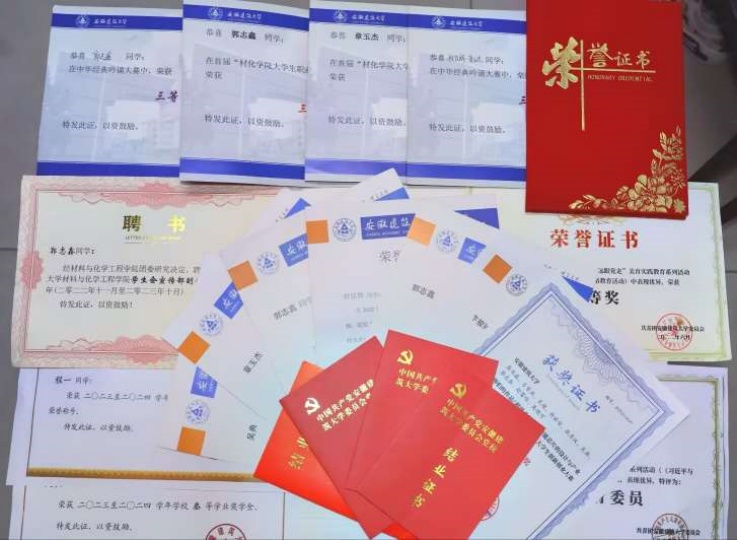 桌面布满的奖状、证书,更是三年来赢取的功勋;大学生职业规划大赛、大学生创新创业大赛,都留下了属于他们的脚印;党课结业证书、学生会部长聘书,是他们全面发展的足迹;奖学金、荣誉证书,是对他们努力的表彰,他们不仅懂学习会学习,更够努力够出彩。这些荣誉是他们共同参赛、共同思考、共同赞扬,留下的彼此痕迹。也许多年后,再次拿起这份证书、奖项,脑海中的回忆却是那身边人的坚定支持,这才是时间的馈赠。