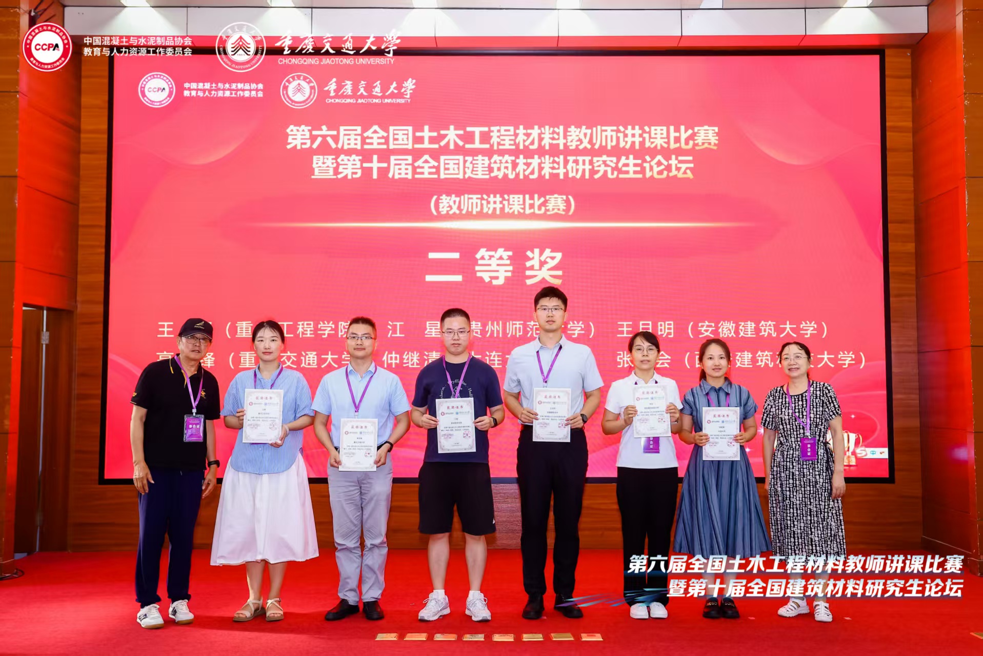 本网讯 715日至17日,第六届全国土木工程材料教师讲课比赛暨第十届全国建筑材料研究生论坛在重庆交通大学成功举行。材化学院青年教师王月明凭借《“魔法药水”混凝土的外加剂——减水剂》课程的精彩讲授,从全国60余所高校的60余名参赛选手中脱颖而出,斩获二等奖。学院院长王爱国、副院长张峰君带队全程观摩指导。