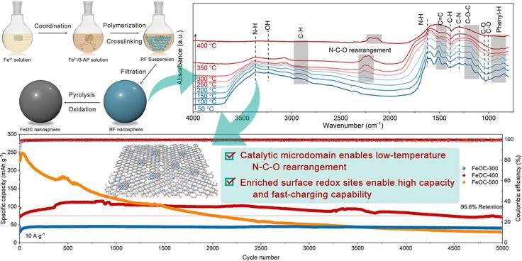 锂离子电池作为一种重要的电化学储能器件,在电动交通、人工智能、规模储能等领域有着广泛应用。石墨负极的发展日益趋近其理论极限,已无法满足下一代高比能锂离子电池的需求,因此亟需开发高能量密度和高倍率新型碳基负极材料。如何在保证材料性能的前提下降低材料的碳化(热解)温度是解决这一问题的途径之一。李琼光团队报道了一种基于催化微域工程(Catalytic Microdomain Engineering)的高倍率碳负极低温制造技术,在低于500℃的热解温度下,FeOC系列材料贡献出高可逆容量、倍率性能和循环寿命。该工作探索了低温热解碳负极在高比能锂离子电池负极中的应用,并通过多种原位/非原位表征手段系统的研究了材料的形成过程、储能机理和失效机制,并与磷酸铁锂正极匹配验证了其在全电池中可行性,对降低规模储能用碳负极的制造成本具有十分重要的指导意义。