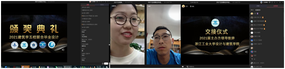 当晚还进行了线上颁奖晚会,王薇副院长做了总结发言,学生代表谈了本次设计的感想,老师们也对即将踏入新的学习环境与工作岗位的同学们提出了宝贵的未来发展建议。最后,晚会还就下一届联合毕业设计安排作了交接仪式,浙江工业大学系领导做了交接发言。至此,本次全国建筑学“5+1”联合毕业设计答辩及汇报交流会圆满落下帷幕。