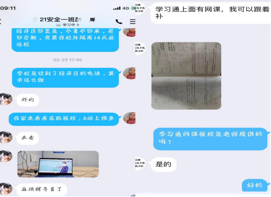 学业帮扶有益补充。学院积极发挥学生干部作用,安排主要学生班干开展“远程”帮扶,传达课程任务,提供学习笔记,实施知识答疑,为未返校学生提供精准化的学业帮助,让居家的学生也能体会集体归属感。