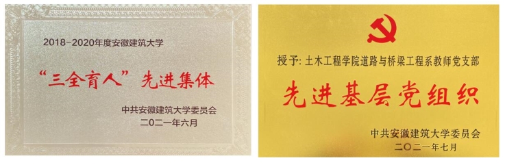 支部教师党员以树人为核心,心系“院系事”、肩扛“支部责”,谋划学科建设,深耕专业发展。支部党员韦璐同志率先垂范当标杆、周宇同志勇于创新求实效,分获学校2021年、2022年优秀共产党员称号。支部所在基层教学组织荣获2018-2020年度“三全育人”先进集体称号。2021年,道路与桥梁工程系教师党支部获学校“先进基层党组织”荣誉称号。
