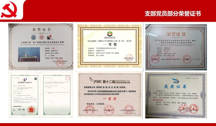 党支部积极探索新形势下基层党支部的育人新模式,以培养“有理想的奋斗者,有本领的实干者”为目标,通过“师生联动”、“生生联动”,鼓励广大同学积极参与课题研究、学科竞赛和创新创业。近两年,支部党员在各条赛道上均取得了优异成绩。张叶伟获全国结构模型大赛一等奖、安徽省结构模型大赛特等奖;张谦硕获得“互联网+”主赛道安徽省铜奖;张栩瑞、陶树获安徽省结构模型大赛一等奖;张浩获安徽省桥梁设计大赛一等奖及全国大学生结构设计信息技术大赛三等奖;苏凌飞同学获安徽省大学生校园足球联赛三等奖;梅翔等发表SCI论文1篇;2022年支部39名毕业生党员中有32人考取硕士研究生,录取率82.2%,其中多名学生被哈尔滨工业大学、东南大学、厦门大学、香港理工大学等名校录取。