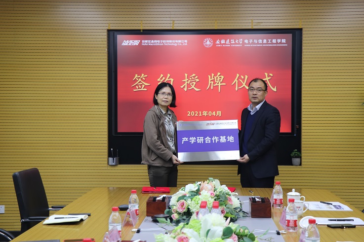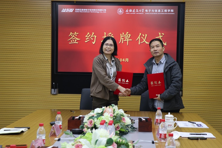 合肥宏晶信息科技有限公司总经理崔莹莹介绍了公司的基本情况、技术团队、业务发展和业绩情况。电子与信息工程学院院长陈杰介绍了学校和学院近年来取得的办学业绩,希望通过进一步深化校企合作,实施产教融合,培养符合社会发展的应用型人才,更好地服务地方。双方围绕专业建设、人才培养模式、实习实训、就业创业、科学研究等方面进行了详细深入交流,就共建产学研合作基地、人才培育、课程建设、项目合作等内容进行了探讨。最后,双方代表在校企产学研合作协议上签字,举行了授牌仪式。