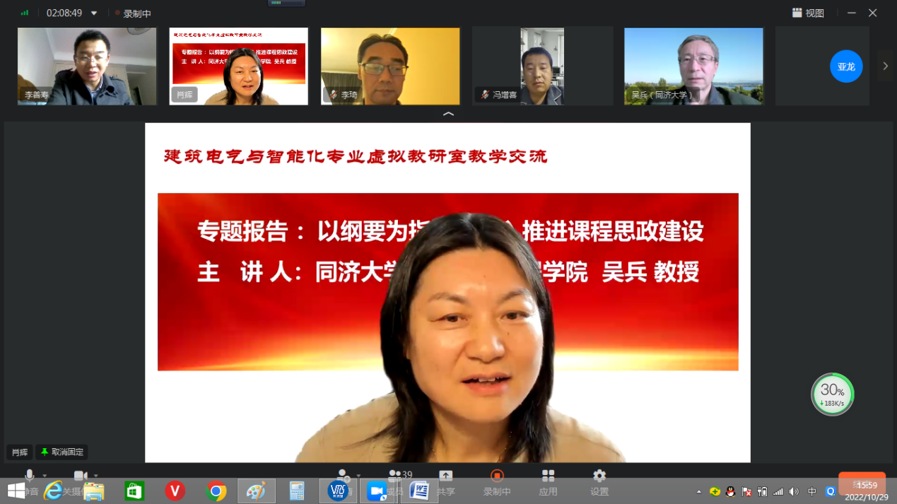 本网讯 10月29日下午,由我校牵头建设的“建筑电气与智能化专业”全国首批虚拟教研室,通过虚拟教研室平台举办了“以纲要为指导 深入推进课程思政建设”的课程思政示范课建设活动,本次活动由教研室轮值主任同济大学肖辉教授主持,主讲嘉宾同济大学交通运输工程学院吴兵教授分享了自身主持“交通运输类课程思政研究”国家虚拟教研室建设和国家课程思政示范课程建设的经验,以及在相关专业理论课程教学中的若干课程思政改革实践。本次活动共有来自全国近20所高校,50多名教师参与。