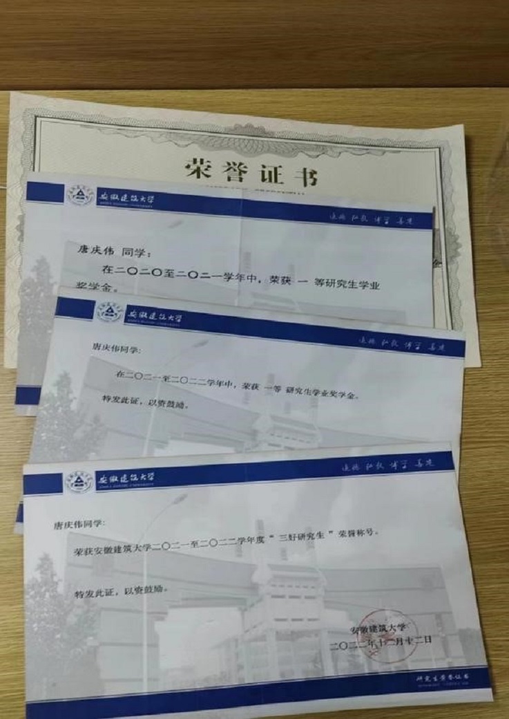 功夫不负有心人,唐庆伟的表现和成绩赢得了众多的荣誉,先后获得了安徽省优秀毕业生、安徽省优秀硕士论文、三好研究生等荣誉称号,并在毕业时以优异的成绩被合肥工业大学录取为2023级博士研究生, 未来还会在学术的道路上继续探索。