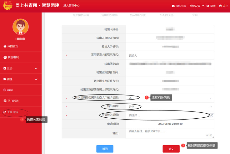 注:1.已经发起转接并且转接成功,但不在对应团支部的同学需重新发起转接,转入对应所在班级团支部,操作流程如上。