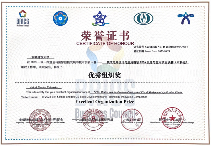 本网讯 近日,2023“一带一路”暨金砖国家技能发展与技术创新大赛集成电路设计与应用赛项全国总决赛在湖北武汉举行,来自全国200多所高校的近千名学子逐梦赛场,经过激烈角逐,电子与信息工程学院陈敏洋、温中杰、刘建强三位同学荣获安徽省一等奖,全国二等奖,我校荣获优秀组织奖。