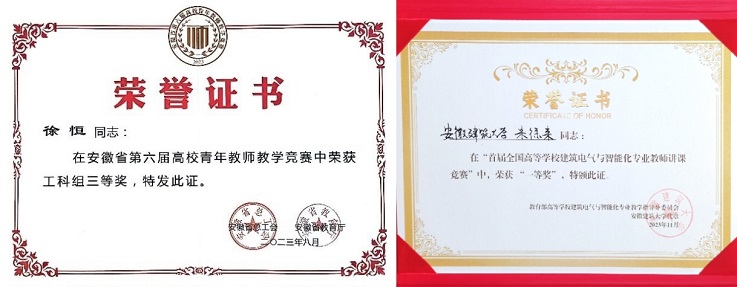 2023年,5名教师获得工信部“FPGA应用开发工程师(高级)”认证。学院荣获第三届高校教师教学创新大赛全国二等奖1项,安徽省一等奖1项;第八届全国计算机类课程实验教学案例设计竞赛全国二等奖1项、安徽省第六届青教赛三等奖1项、首届全国高等学校建筑电气与智能化专业教师讲课竞赛一等奖1项、第八届全国计算机类课程实验教学案例设计竞赛二等奖1项;校课程思政教学比赛二等奖4项,三等奖1项;2名教师分别荣获校第二届“东方节能”优秀教学奖二三等奖。
