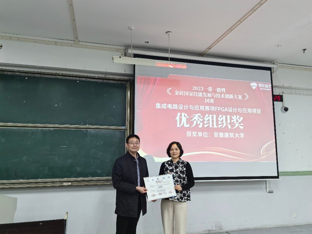 活动过程中,所有参加“版图设计实践课程”的同学获得由安徽青软晶芒微电子科技有限公司与合肥国家“芯火”双创平台联合颁发的结业证书,并表彰了2023年在“集成电路设计与应用赛项”中获奖的同学。同时,为电子工程系副主任赵阳老师颁发了优秀组织奖。